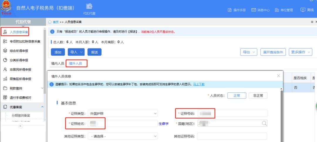 (1)境外人员证件号码或姓名改变时,扣缴单位财务人员应在自然人电子税务局扣缴端的【人员信息采集】-【境外人员】模块修改信息,而不是重新采集。修改成功后,无需对之前申报的数据进行更正申报,系统会将新旧信息自动进行归集。