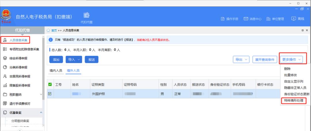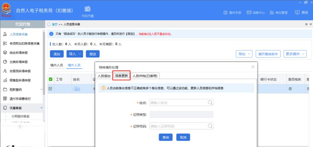 (2)由于证照类型不允许修改,境外人员证件类型改变时,扣缴单位只能在扣缴端重新采集信息,生成一条新的人员信息,并前往办税服务厅办理并档业务,将新旧两条人员信息合并。 并档后,扣缴单位需在扣缴客户端对并档信息进行更新。(操作参考下图)